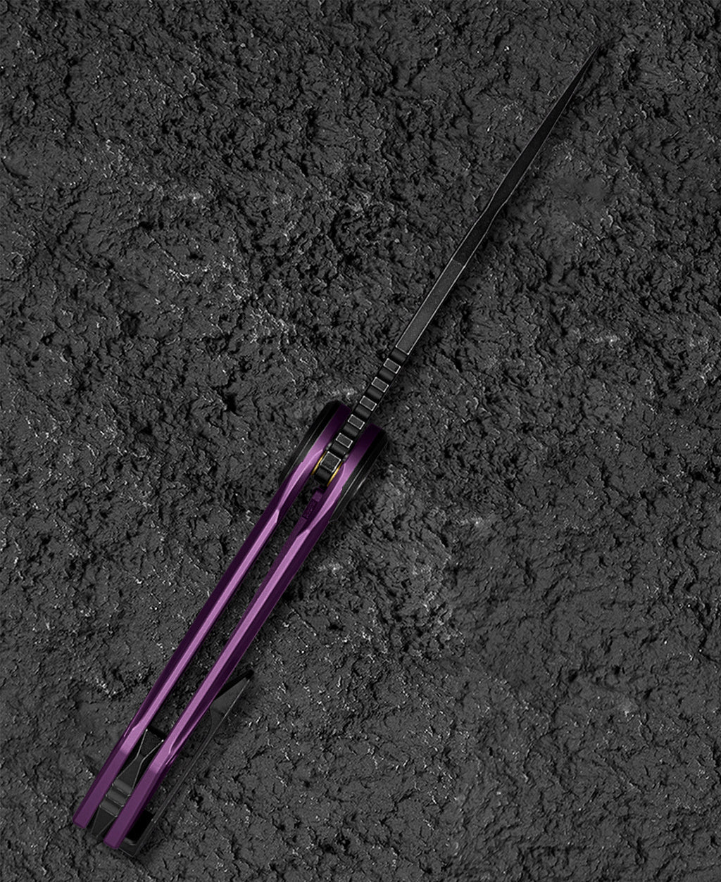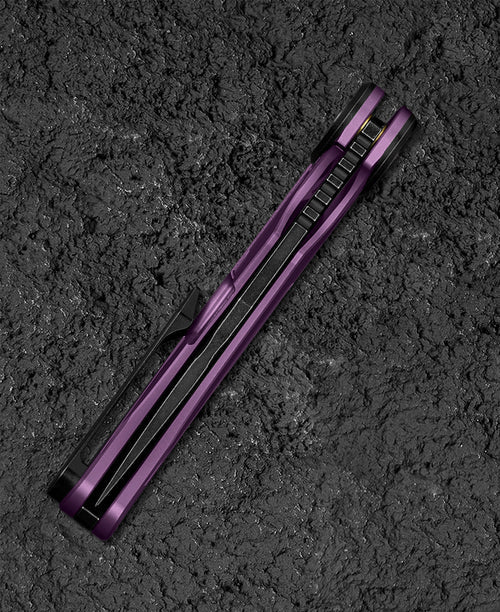 The Bestech Seraph BT2403C in purple titanium showcases sophisticated design paired with high-performance materials. Featuring an M390 stainless steel blade finished in black stonewash with flat satin treatment, this knife combines aesthetic appeal with practical functionality. M390 steel is renowned for exceptional edge retention and corrosion resistance, making it suitable for varied cutting applications and environments. The blade geometry—3.66 inches long with a 0.150-inch thickness—is hardened to 59-61 HRC, striking an optimal balance between edge sharpness and toughness. The frame lock mechanism delivers secure blade retention with minimal lateral movement, ensuring safe operation during extended use. The distinctive purple-anodized titanium handle provides both visual distinction and lightweight durability, while the full titanium construction—including pocket clip and backspacer—guarantees long-term reliability and corrosion resistance. Ceramic ball bearings facilitate smooth, responsive blade deployment and retraction with consistent performance. Weighing just 119.6 grams, the Seraph maintains excellent carry comfort without sacrificing structural integrity. At 8.31 inches open and 4.65 inches closed, it offers practical cutting capacity in a pocket-friendly package. Designed by Kombou, this folding knife represents a refined choice for discerning users who value premium materials, thoughtful engineering, and distinctive aesthetics in their everyday carry or collection.