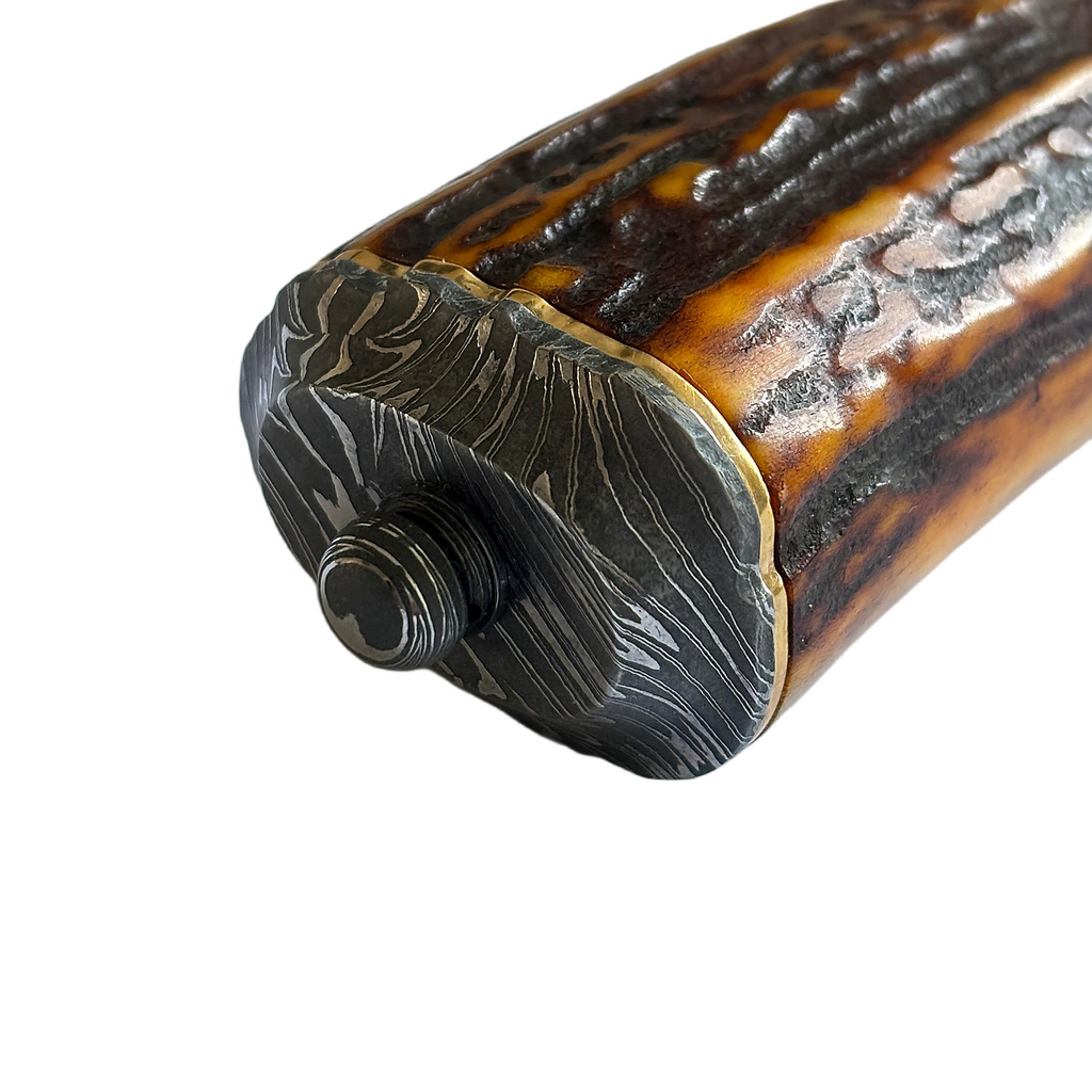 This is a Jimmy Yang handmade custom Bowie knife.Yang has over a decade of experience in custom knife making and specializes in crafting traditional American straight knives.His forte is the Bowie knife,and he has provided OEM custom knives for knife dealers in China and Europe and America,receiving high praise.This piece is a standard gentleman's Bowie knife.The blade is made of Swedish 15n20+O1 forged Damascus steel.The pattern,resembling four-petaled flowers in full bloom,is dynamic,full of tension,and extremely beautiful.The guard is also made of the same Damascus steel.The handle is made of water deer antler,which is smooth and delicate,providing a full and comfortable grip.The exquisitely filed tail iron is polished into a classic petal shape,elegant and unique.It comes with a custom-made sheath.Whether for collection,use,or as a gift,it is a great product.