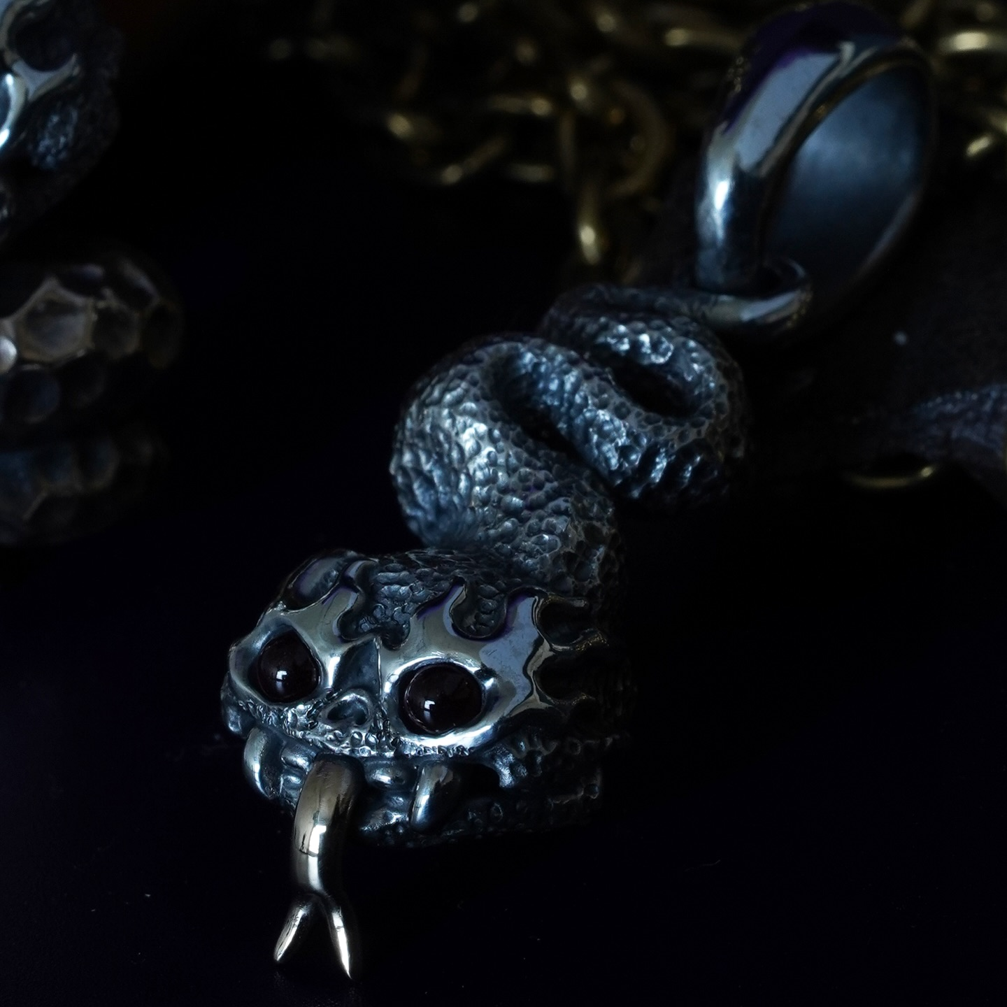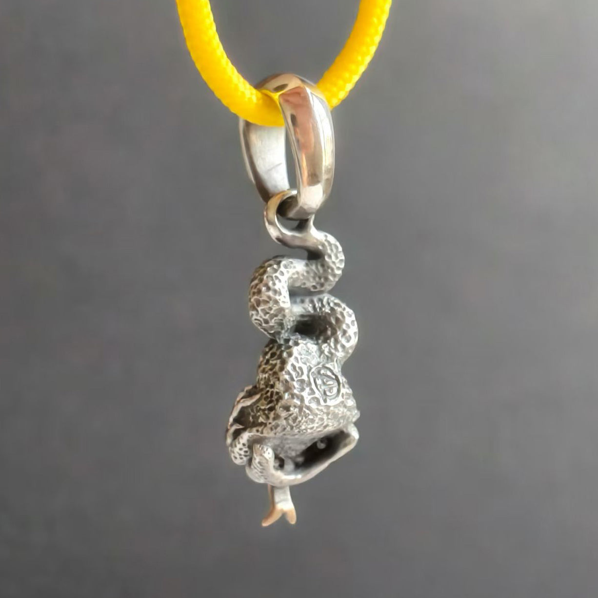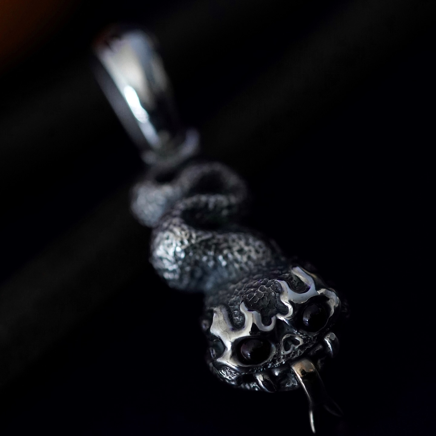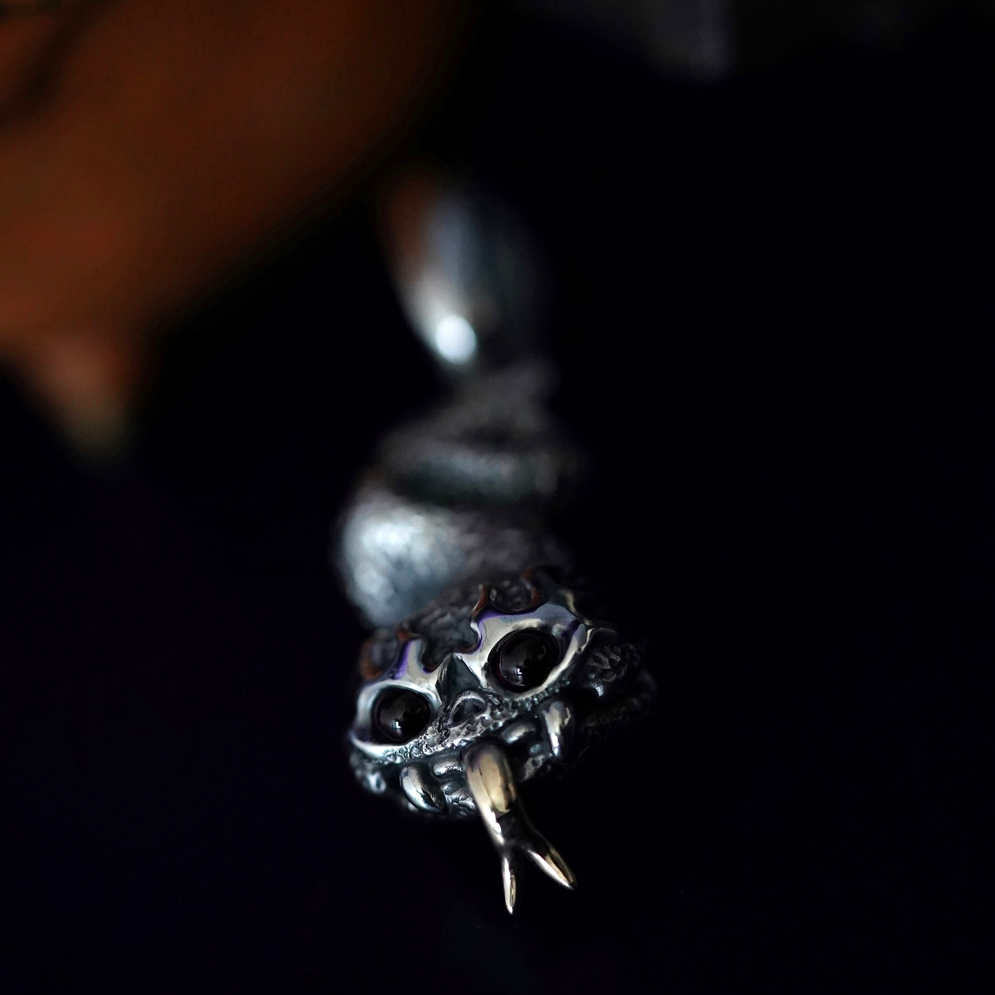 Crafted with precision, the Phase Objects Custom Snake Pendant in silver showcases expert handmade artistry. Its intricate design captures the fluidity and elegance of a snake, making it a distinctive accessory that complements any style. This pendant offers a unique blend of craftsmanship and symbolism, perfect for those who appreciate detailed, custom jewelry.