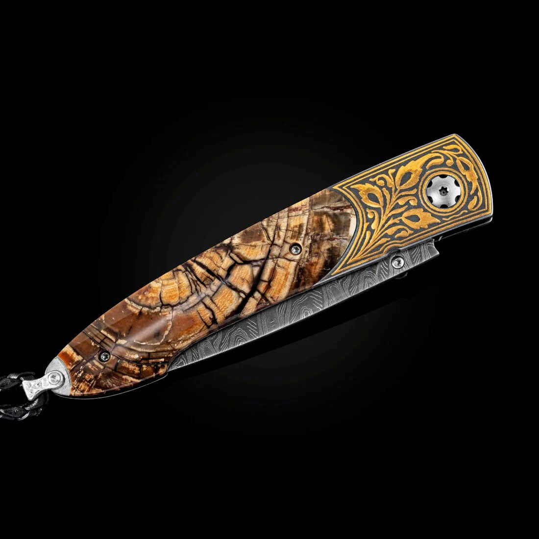 The Lancet ‘Age Old’ features a beautiful frame in 24K gold koftgari (the ancient Indian art of inlaying gold in tool steel), inlaid with the ring-cut of a 10,000 year-old fossil Woolly Mammoth tusk. The blade is hand-forged ‘Hornets Nest’ damascus by Mike Norris; the one-hand button lock and the thumb stud are set with white topaz gemstones. The ‘Age Old’ features some of the exotic materials and hand-forged metals that are the hallmark of William Henry’s collections; a distinctive personality statement to be worn and used for a lifetime.