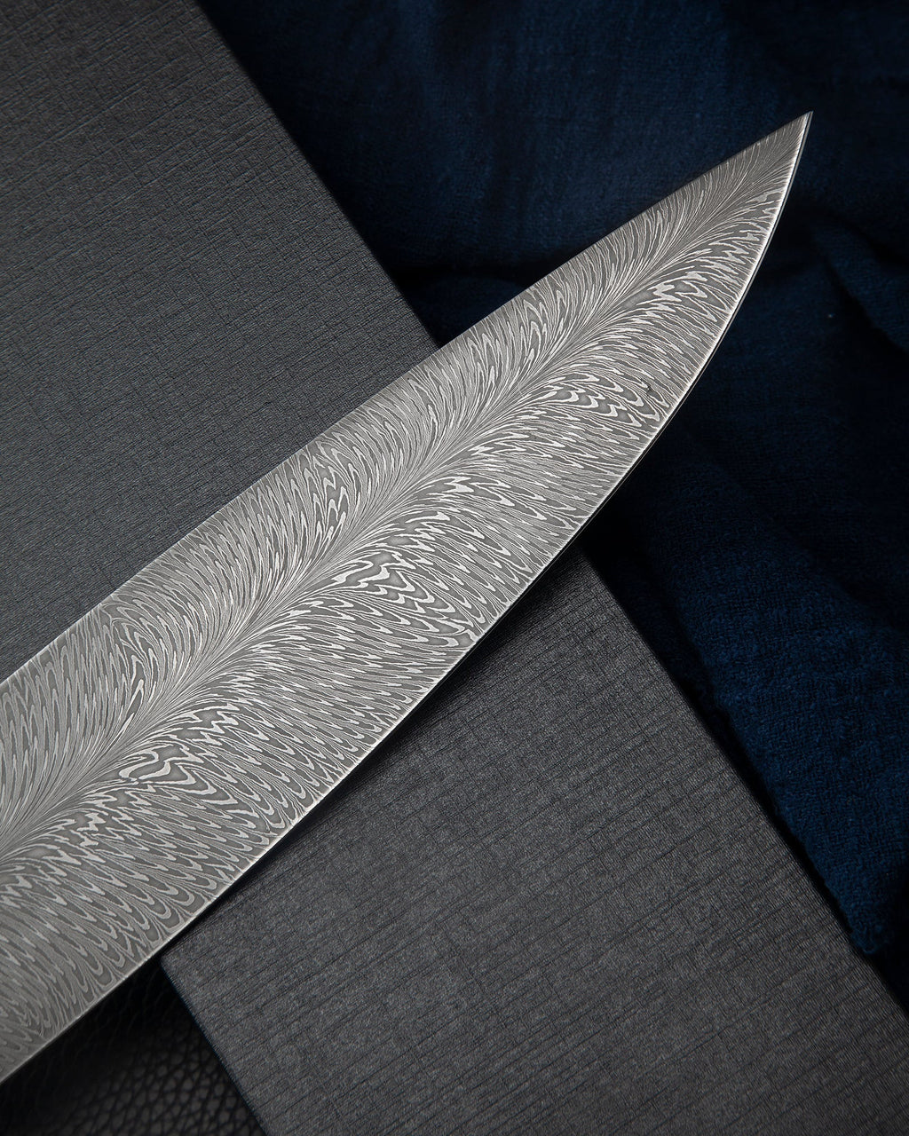 This knife is one of the topmost crafted damascus knife. It's under folded forging to present this extrodinary 3600 layer feather pattern. Blade is made of Sandvik 15n20 steel, hardness reaching HRC59 with nice strength and durability.The handle made of ironwood and mammoth ivory fossil.