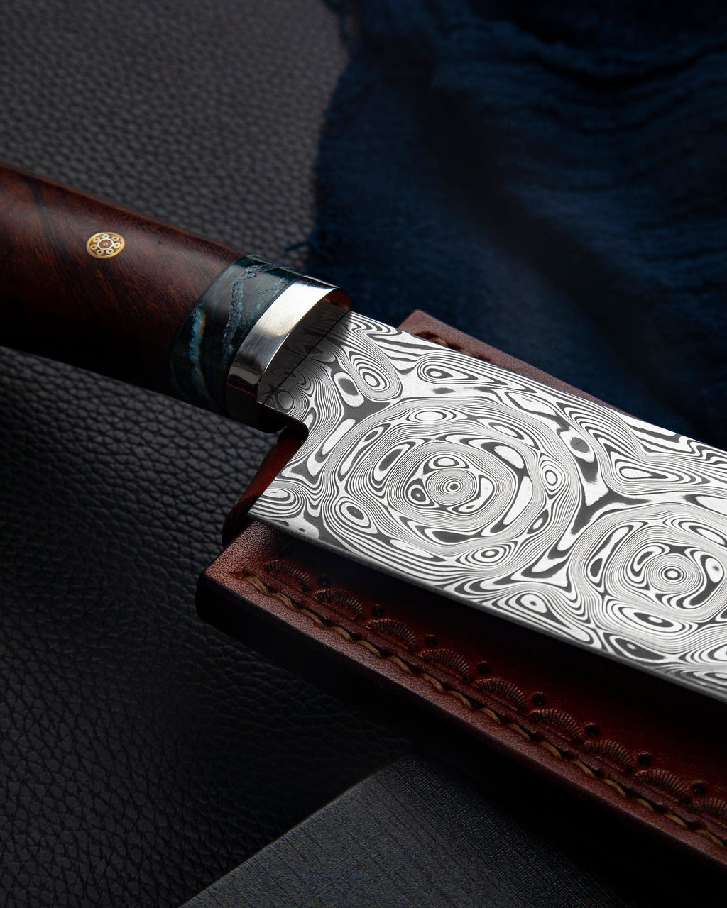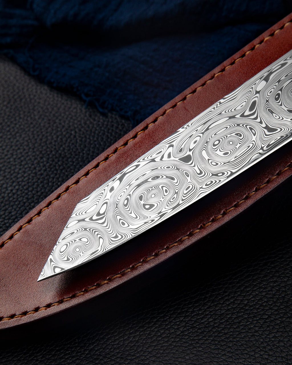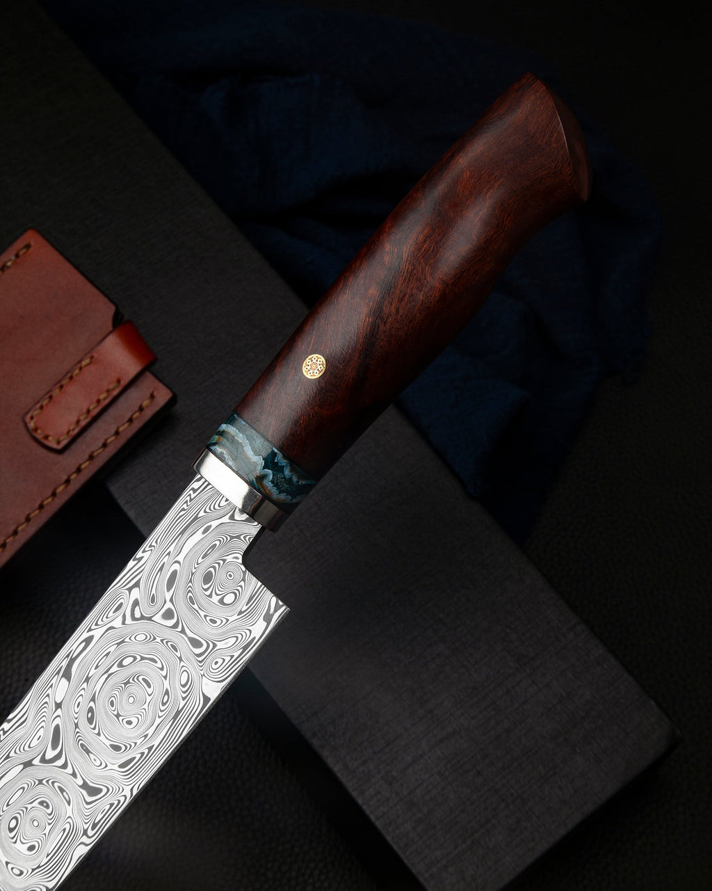 This knife is a combination of top material and top craftsmanship. Blade applies Damasteel Grosserosen with superior strength and durability, and handle applies ironwood and mammoth ivory fossil. It will be the one worthy for collection.