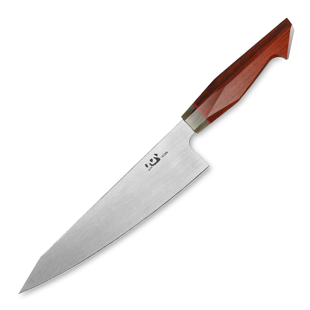 This knife is handcrafted by very experienced craftsmen with decades of experience of knife hand-making. The blade is Sandvik 14C28N steel with hand satin finish. The fine convex grind of the edge forms a nice arcuate shape and an extremely sharp performance. The handle is exclusively designed multangular shape, applying rosewood and buffalo horn, jointed with nickle silver or red G10. With the elegant design, the whole body applies a full tang structure to achieve the best balance and longest using durability.