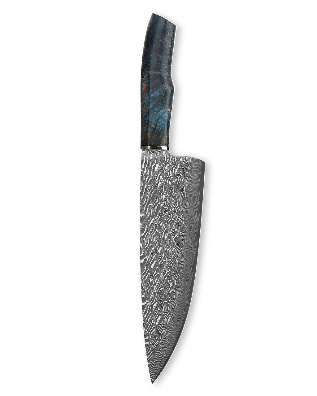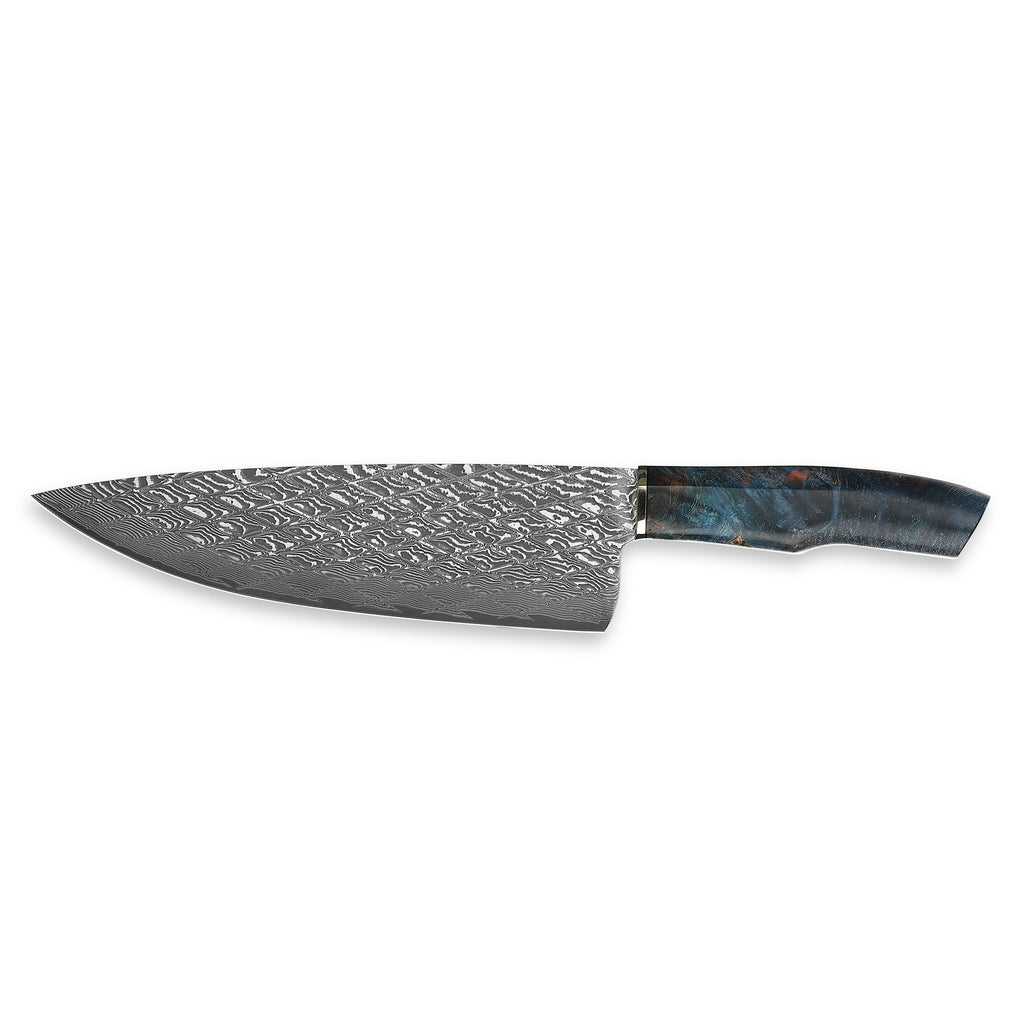 This chef knife is handcrafted by very experienced craftsmen with decades of experience of knife hand-making. With an ultra thin blade forged by 67 layer VG10 core damascus steel, with the core hardness reaching HRC61+/-1, this knife performs an extremely sharpness. The handle applies stabilized maple burl wood in blue color and brass for spacer, which maximizes the stability and anti-corrosion property, and presents beautiful and elegant blue figures. The knife is also well balanced and applies full tang structure, which makes it a very handy tool for meeting the most of requirements in the kitchen.