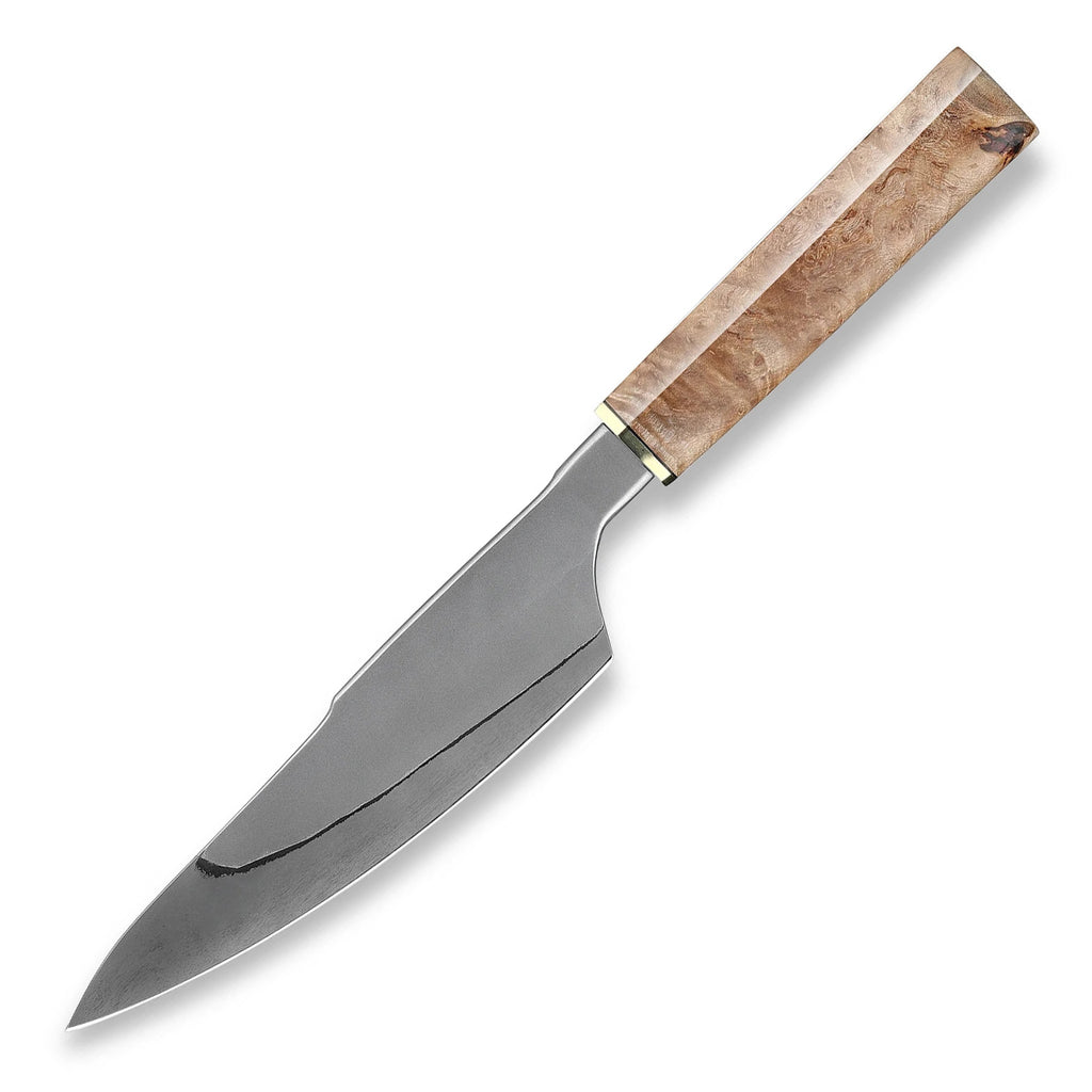 We apply stabilized spalted maple burl for the handle, and joint with brass spacer. The whole knife body is full tang structure and handy enough to help on flexible cutting tasks.