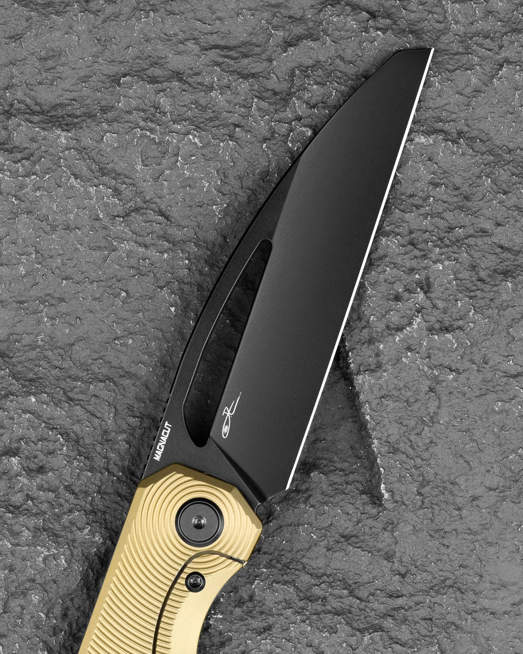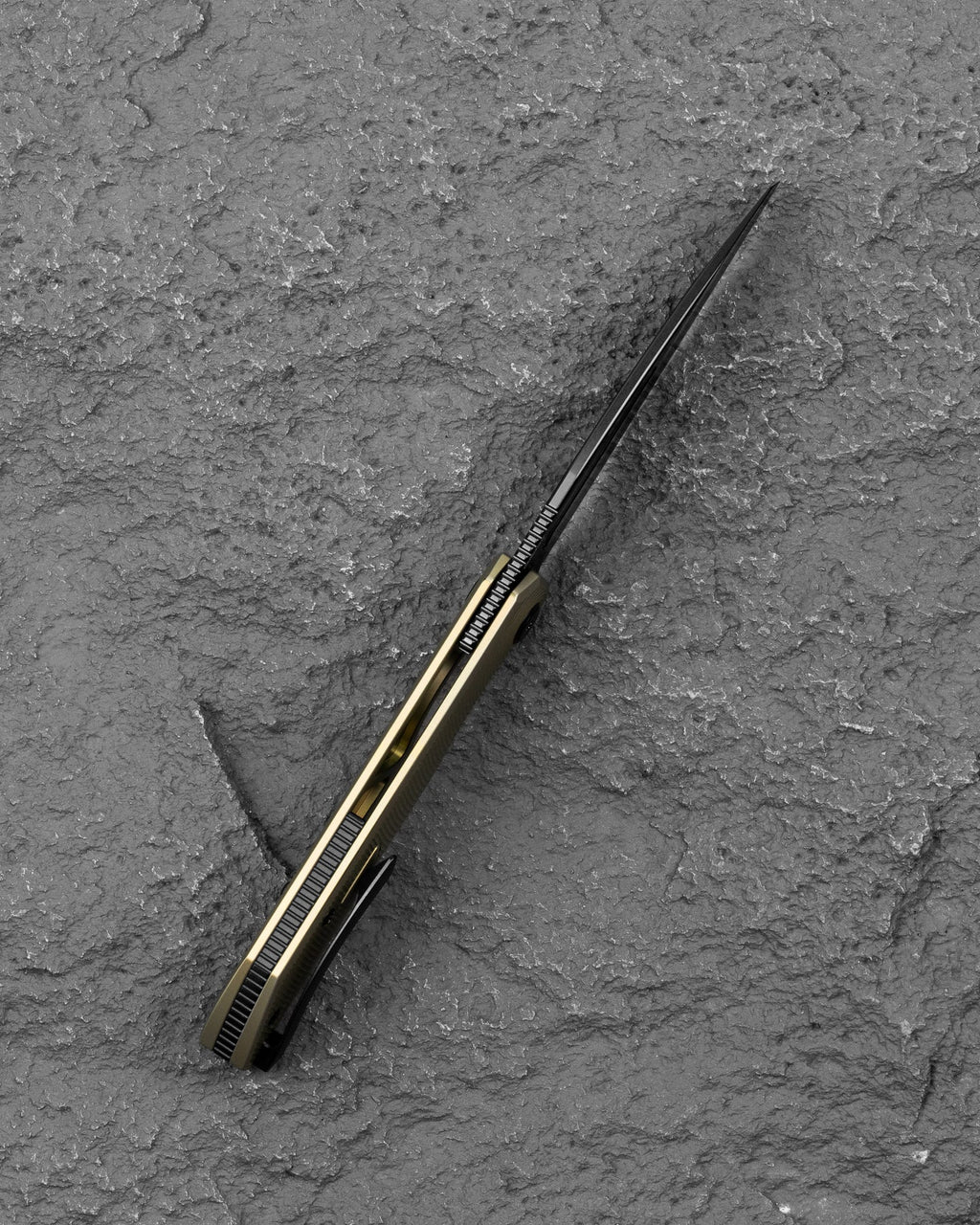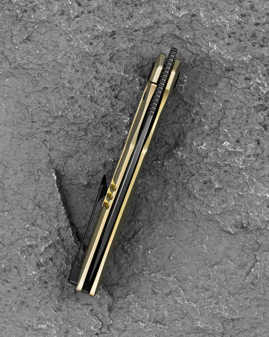 The Bestech Taipan BT2503B MagnaCut Blade Titanium Handle Frame Lock Folding Knife is the ultimate combination of durability and precision. The MagnaCut blade is finished with Black PVD for added strength and the titanium handle, featuring a bronze color, adds a touch of elegance. The blade is 3.728" in length, with a thickness of 0.118" and a 62-64 HRC hardness, making it a reliable and long-lasting tool. The pivot collar and clip are also made of titanium and finished with Black PVD, creating a cohesive and sleek look. With a ceramic ball bearing and a weight of 107.5g, this knife is designed by industry expert James Lowe to provide maximum functionality and ease of use.