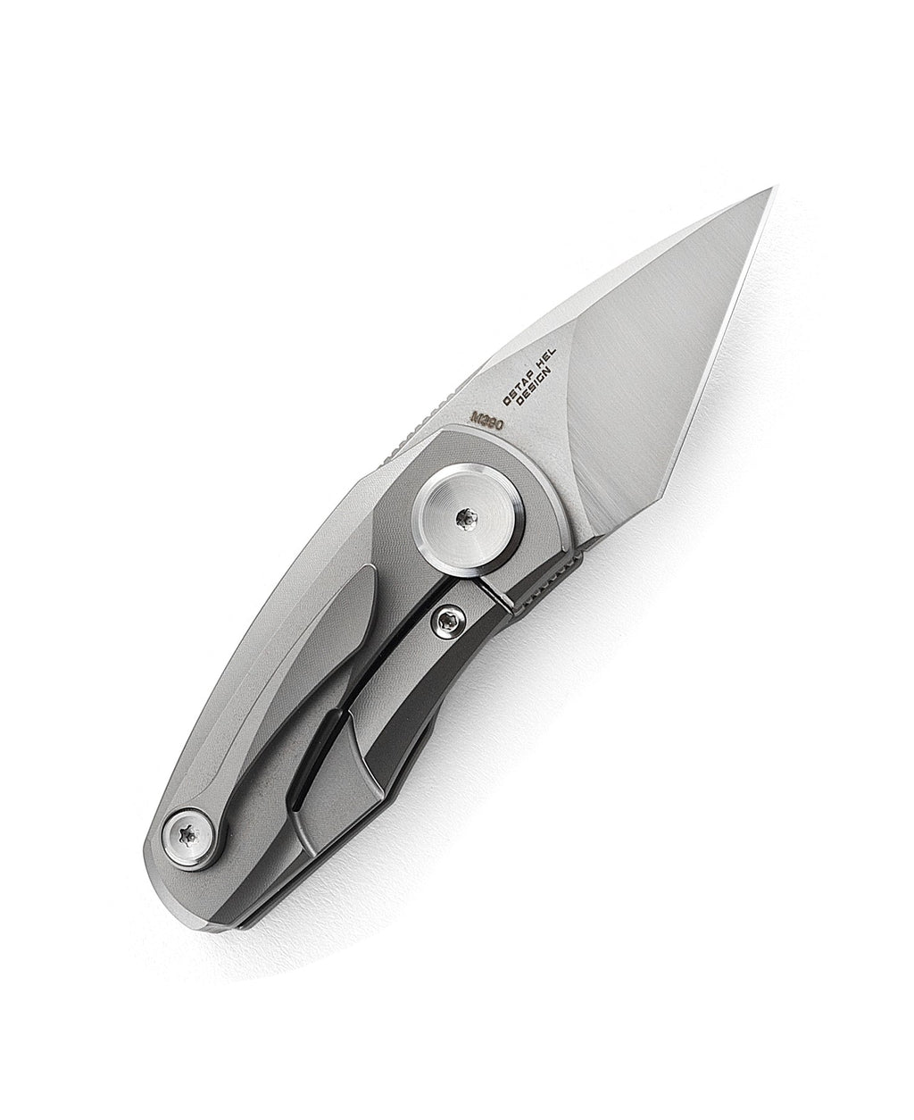 Expertly crafted with high-quality M390 blade material, featuring a stone wash and satin finish, for superior performance and durability. The titanium handle provides a secure grip and features a convenient front flipper for easy opening. This compact folding knife measures 3.86 inches in overall length, with a closed length of 2.52 inches and a blade length of 1.34 inches. With a ceramic ball bearing and a weight of only 43 grams, this knife is designed by expert knife maker Ostap Hel for maximum precision and functionality.