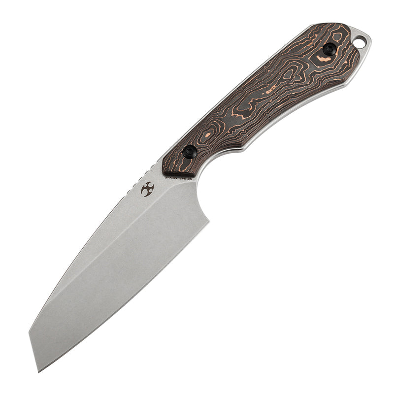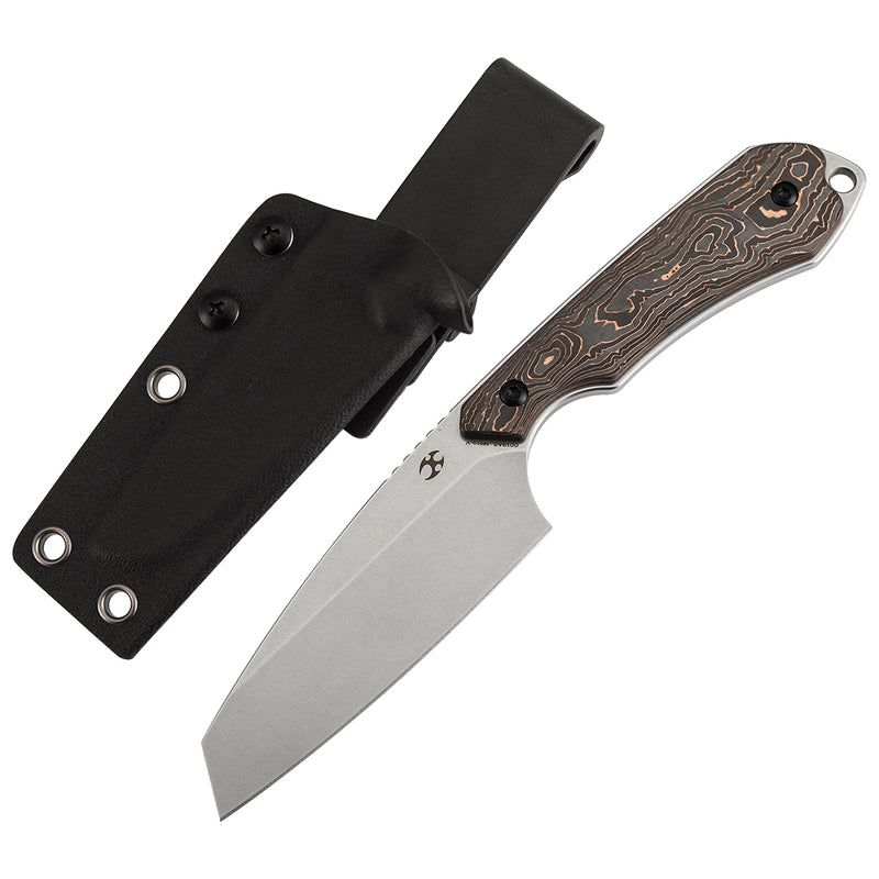The Kansept Valk G019A5 is a precision-engineered fixed blade knife designed for serious everyday carry. Named after the Dutch word for Falcon, this slim EDC tool combines minimalist aesthetics with exceptional functionality. Weighing just 2.2 ounces, the Valk disappears into your pocket or belt without adding bulk, making it the perfect companion for professionals and outdoor enthusiasts alike. The 3-inch Nitro-V blade delivers outstanding edge retention and corrosion resistance, maintaining sharpness through countless daily cutting tasks. Nitro-V steel's superior performance ensures reliable cuts whether you're handling utility work or tactical applications. The stonewashed finish adds durability while concealing minor wear marks. Crafted with premium copper carbon fiber scales, the handle provides a secure, non-slip grip in any condition. The ergonomic design balances comfort with a low-profile silhouette, eliminating unnecessary bulk. The modular construction allows customization, letting you mix and match components for personalized configurations that suit your specific needs. The included adjustable rotating carry sheath offers multiple carry angles, adapting seamlessly to different scenarios—pocket, belt, or tactical positioning. Designed by renowned custom knife maker Greg Schob, a U.S. Coast Guard serviceman and experienced metal fabricator, the Valk represents authentic EDC philosophy: real-world function meets elegant simplicity. This is a knife built for those who demand reliability, portability, and purposeful design in their everyday tools.