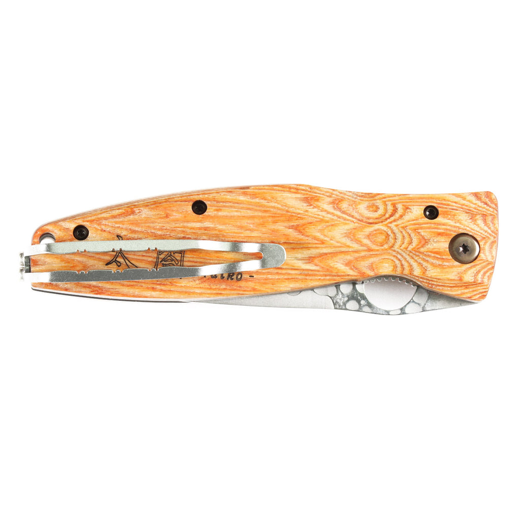 Made in Seki, Japan, Mcusta combines modern technology with traditional Japanese craftsmanship to produce hand finished custom quality production knives. This knife measures 4.75" long closed and features a Tsuchime hammered finish San Mai SPG2 powder steel blade and yellow Pakkawood handle and stainless steel liners. SPG2 is a Japanese powder metallurgy steel that is tougher and has better resistance to corrosion than S30V and its edge retention is comparable to S35VN. The pocket clip is designed for tip-up carry and reversible for right or left-hand carry.